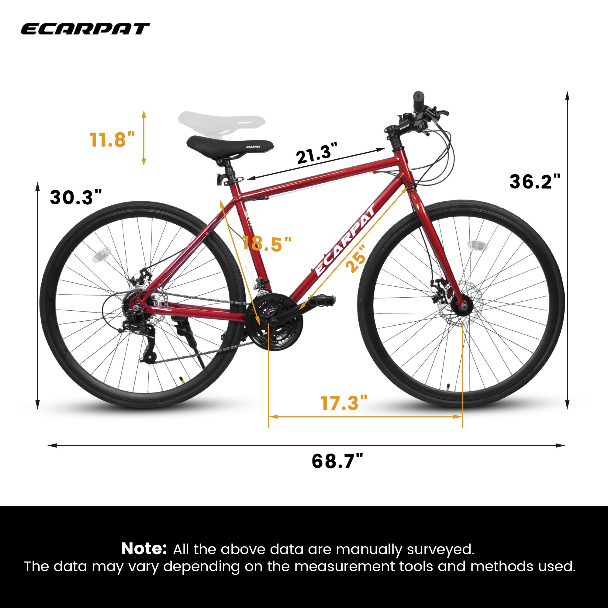 700C Road BikeFrame: Carbon Steel; 18" Height FrameBrake: Dual Disc BrakesShifter: Trigger ShifterDerailleur: 21-speedColors: Black ;RedRider Height: Suitable for 5'4"-6'2" (64-74 inches)