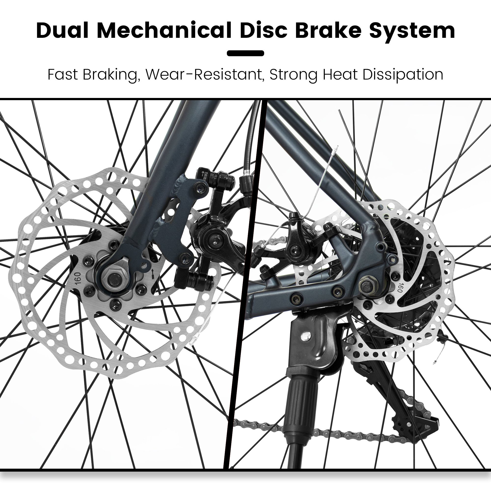 [700C Tires]It takes less energy to keep the bike at speed. 700c wheels have less rolling resistance, making them more efficient, you can ride further using the same amount of energy. These wheels also have better rollover capability, because have a larger circumference, they can more easily roll over potholes, bumps, branches, roots, and other obstacles on the road or trail.