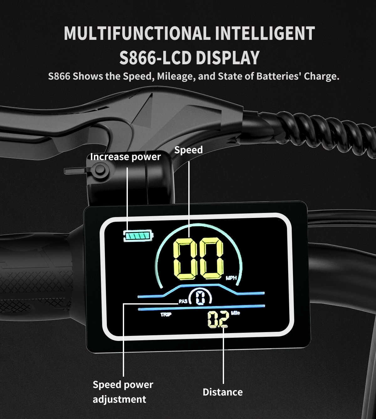 866 LCD displayProvides information includesspeed.battery level.mileage.pedal assistance and more.Pedal assistance 1-5 levels