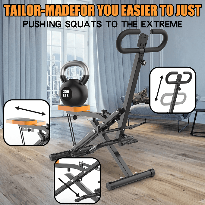 Adjustable Seats & with Resistance Bands: Increase your stability with the wide pivoting pedals and adjustable seat with an anti-slip grip. The squat machine with resistance bands can be added or removed to adjust the resistance of your workout to your fitness level.