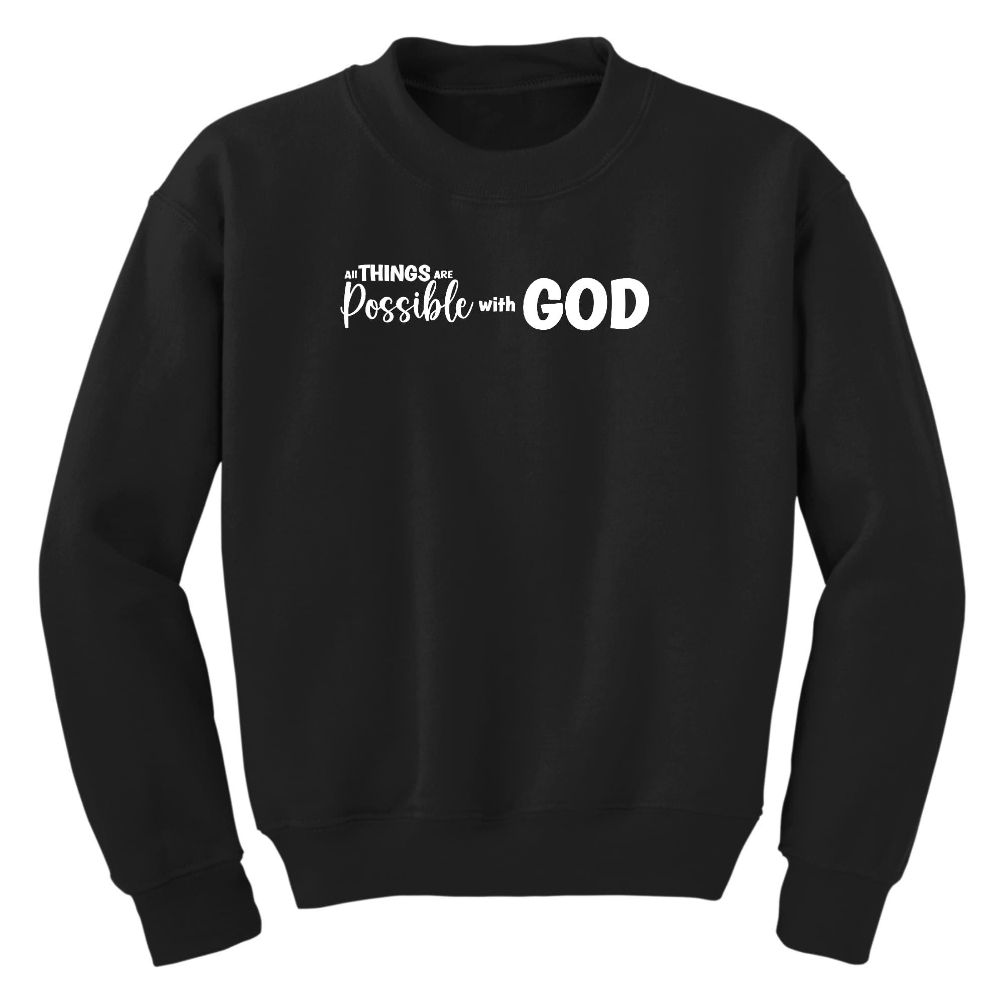 Girls Long Sleeve Graphic Sweatshirt, All Things Are Possible With GOD. This crewneck sweatshirt is durable, made to last, and is comfortable enough to wear all day.