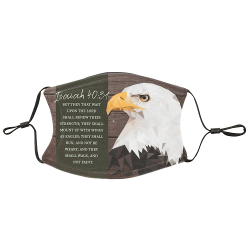 Special Buy! Hurry before it is gone! Inspirational face mask shows eagle design with Isaiah 40:31, "But they that wait upon the Lord shall renew their strength; they shall mount up with wings as eagles; they shall run, and not be weary; and they shall walk, and not faint." Mask has two layers; the outer is sublimated with design on 100% polyester; the inner is soft white 100% cotton.
