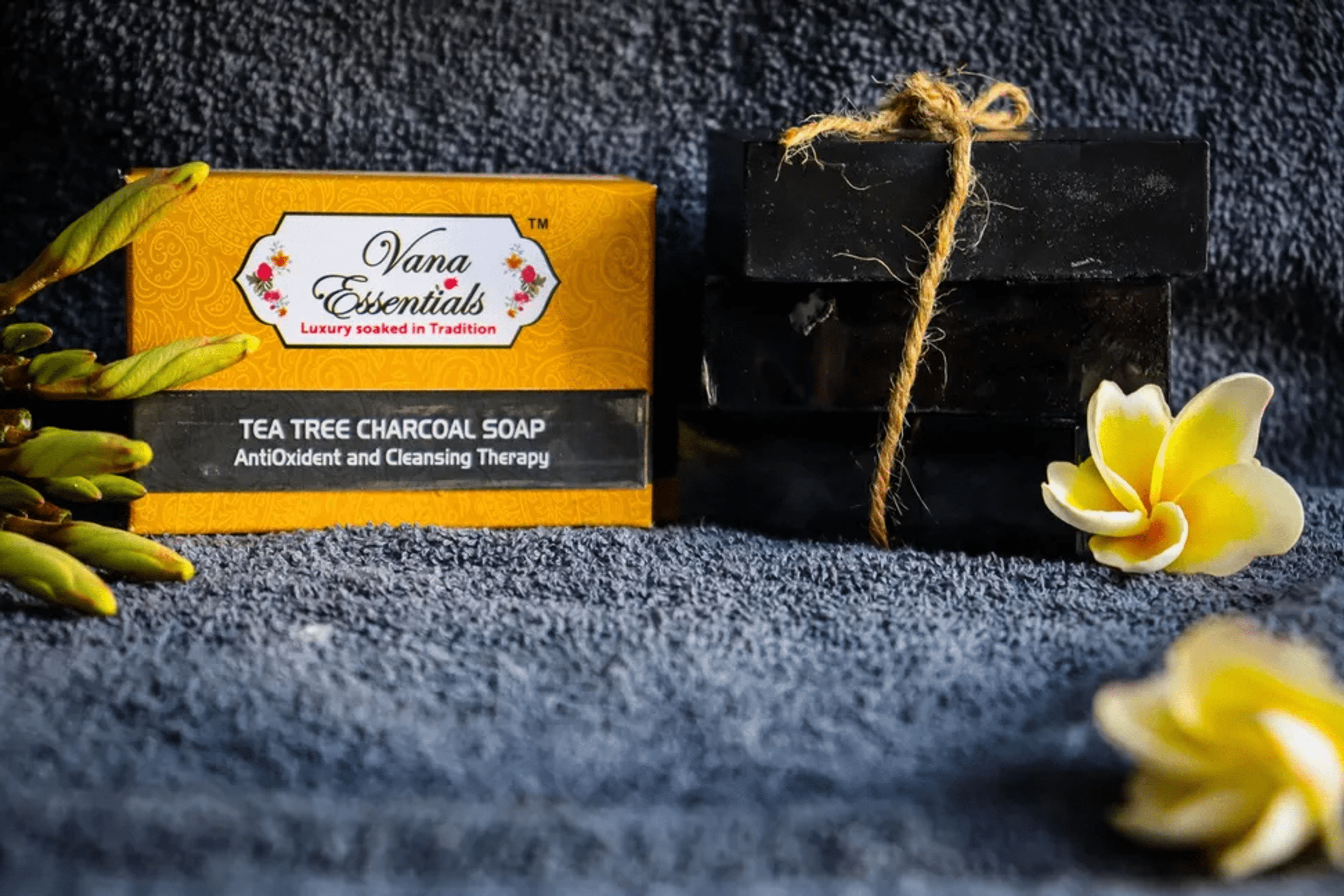 Home > Vana Essentials Organic Tea tree Charcoal Soap (110 gms) Antioxidant & Cleansing Therapy For Blackheads & Acne