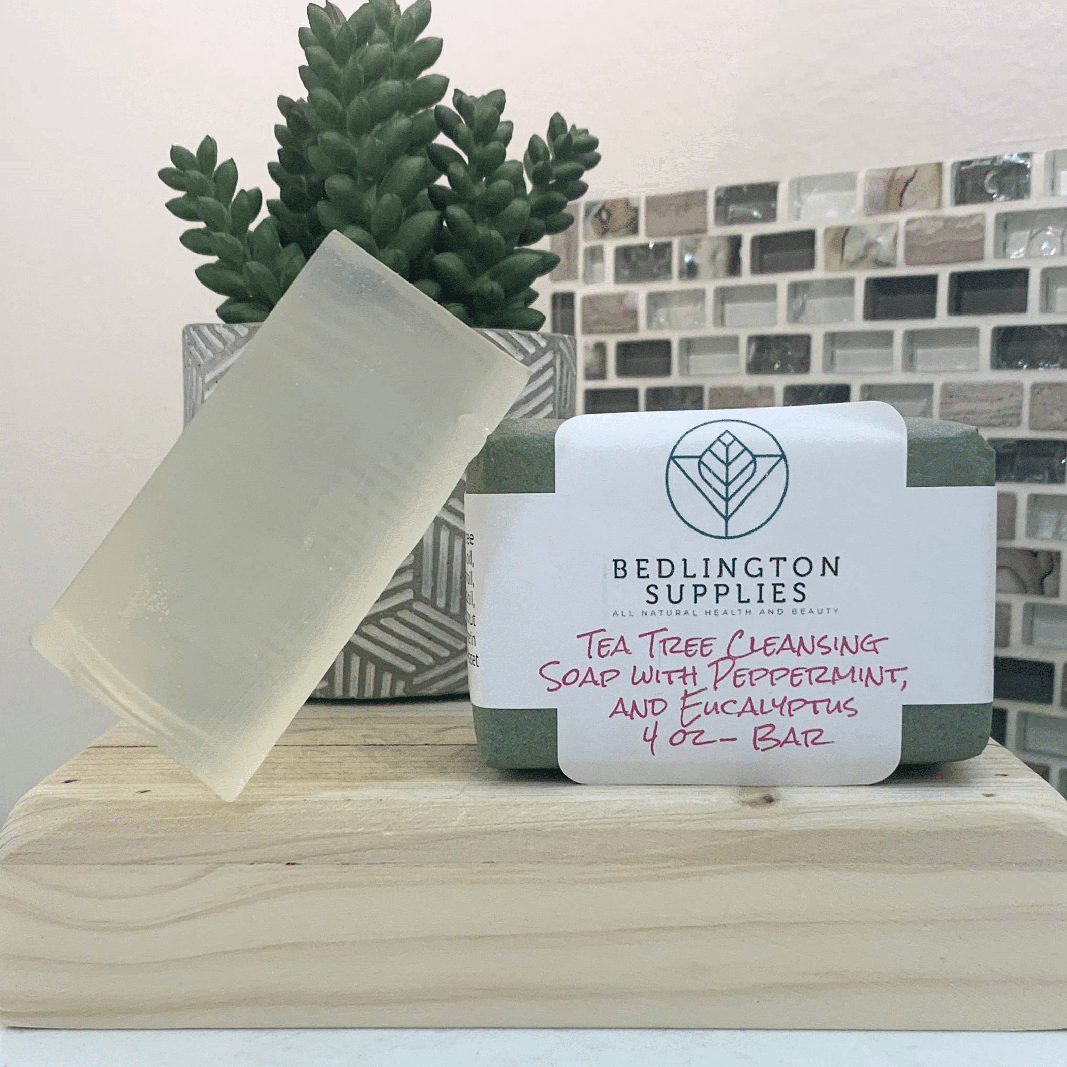 Antibacterial, Antifungal, Cleansing Tea Tree Soap Bar, with Peppermint, Eucalyptus, and Rosemary Essential Oils 4 oz bar of glycerin soap with coconut and palm oil. Handmade in the USA. Ingredients: tea tree essential oil, peppermint oil, eucalyptus oil, rosemary oil, coconut oil, palm oil, glycerin soap base.