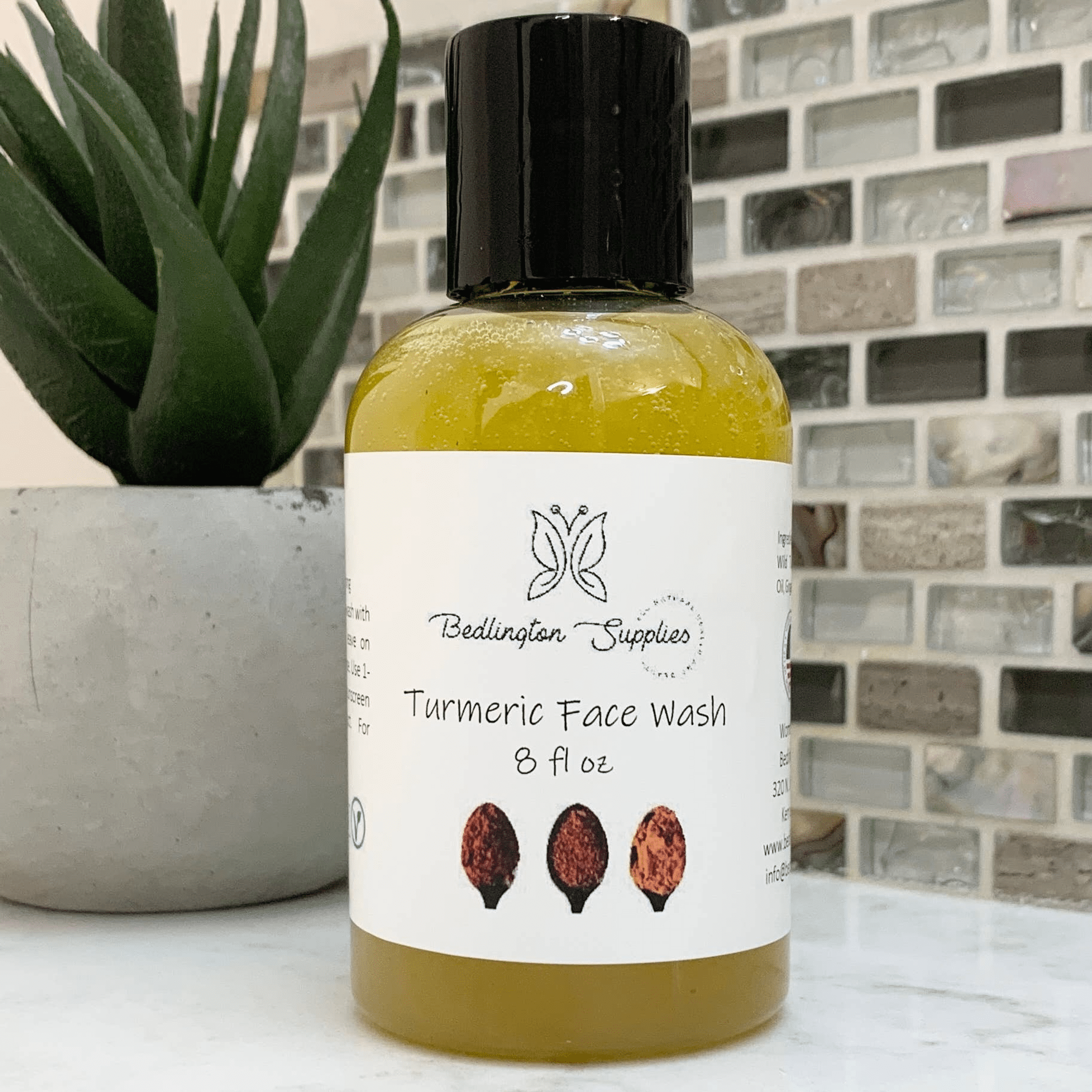 Turmeric Skin Brightening Face Wash, 4 oz. with Pump Top. Handmade in the USA. Ingredients: organic soap base, wild turmeric powder, turmeric oil, ginger oil, lemon oil