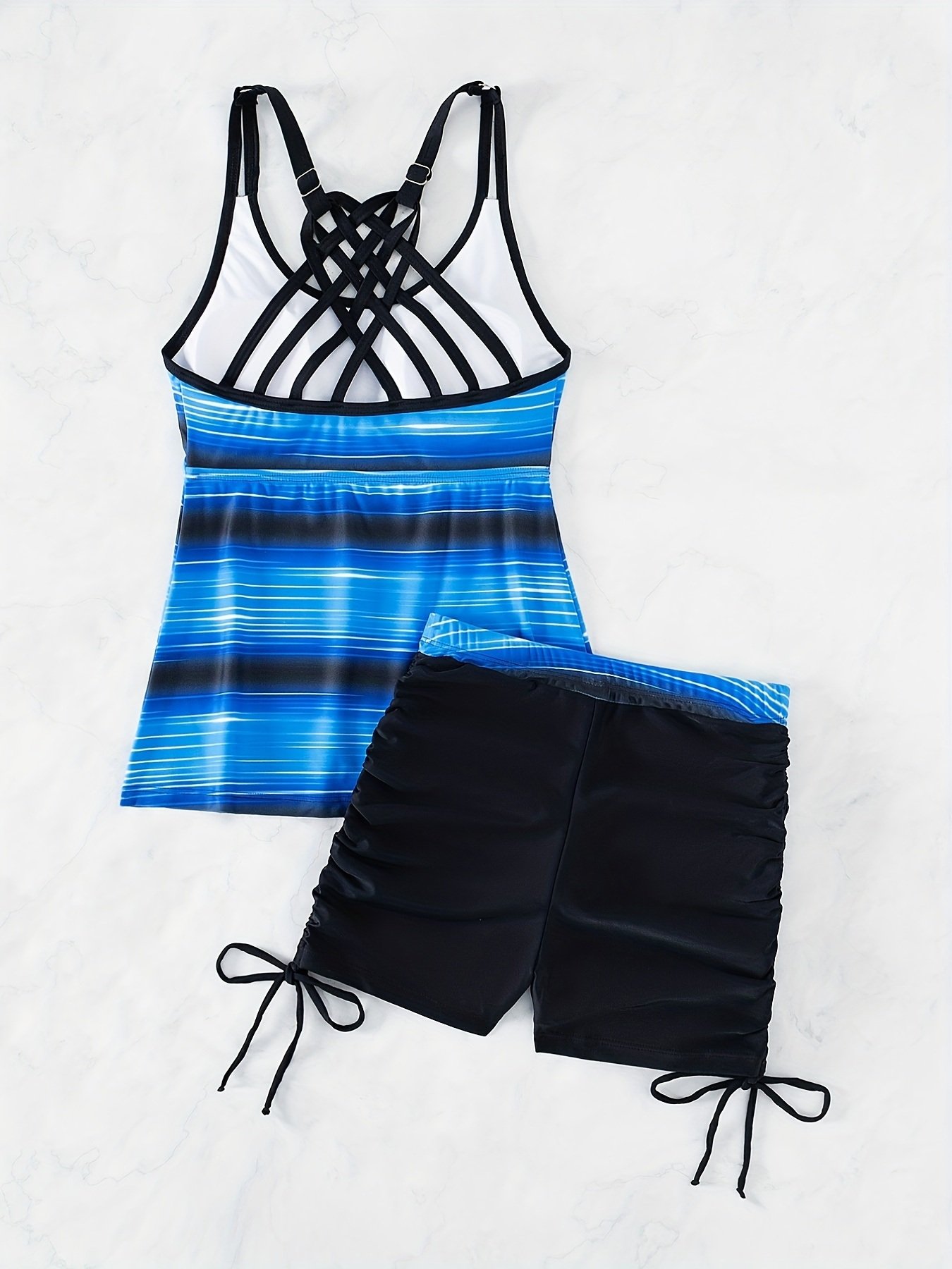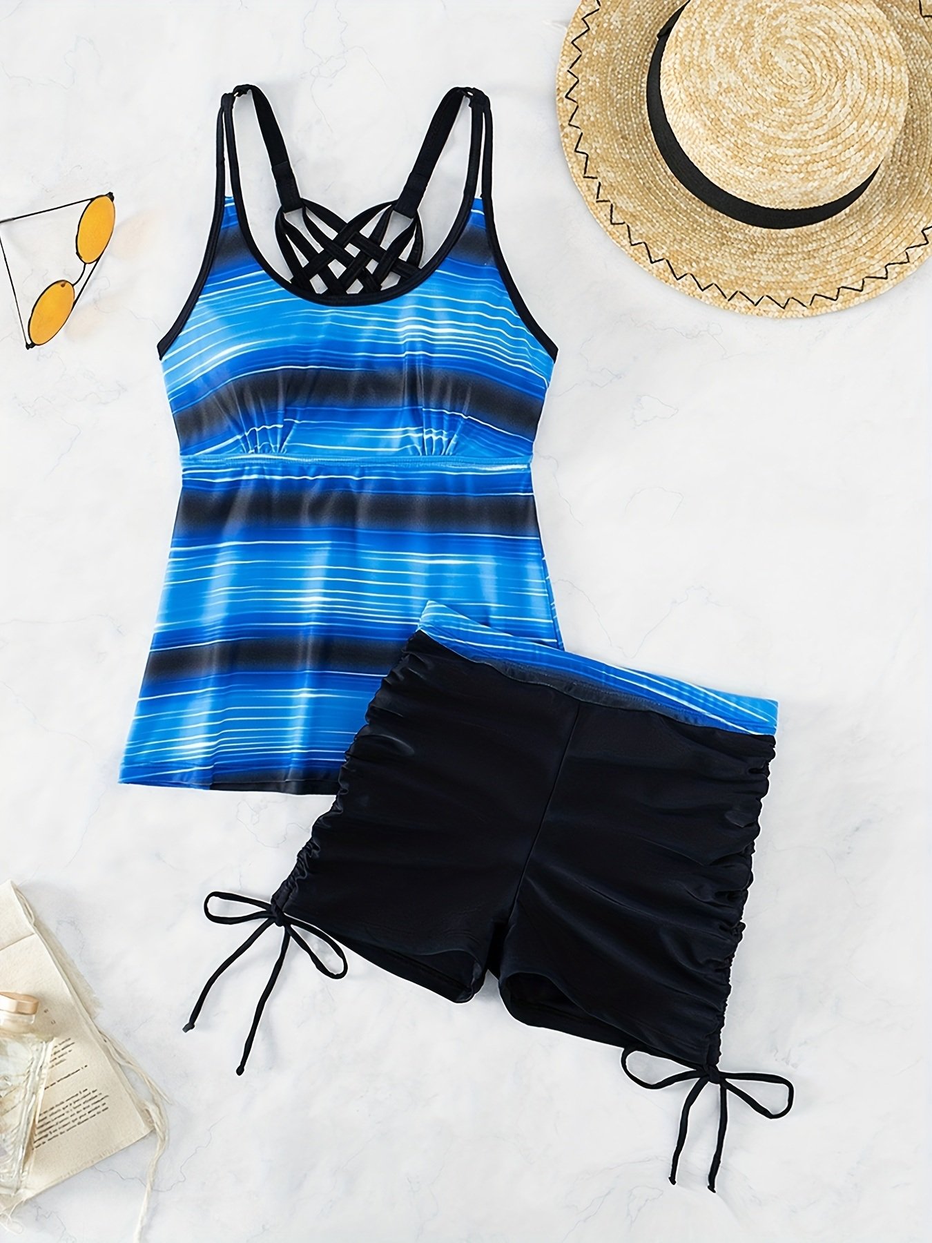 Home > Striped Print Round Neck Tankini Sets, Criss Cross Strap Drawstring Boxer Short Bottom Two Pieces Swimsuit, Women's Swimwear & Clothing